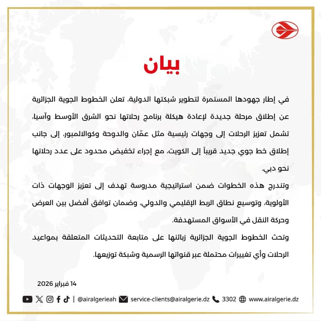 وتأتي هذه الخطوة التي تعد الأولى من نوعها في إطار إطلاق شركة الطيران الجزائرية مرحلة جديدة لإعادة هيكلة برنامج رحلاتها نحو الشرق الأوسط وآسيا تشمل تعزيز الرحلات إلى وجهات رئيسية مثل عمان والدوحة وكوالالمبور إلى جانب مع إجراء تخفيض محدود على عدد رحلاتها نحو دبي.