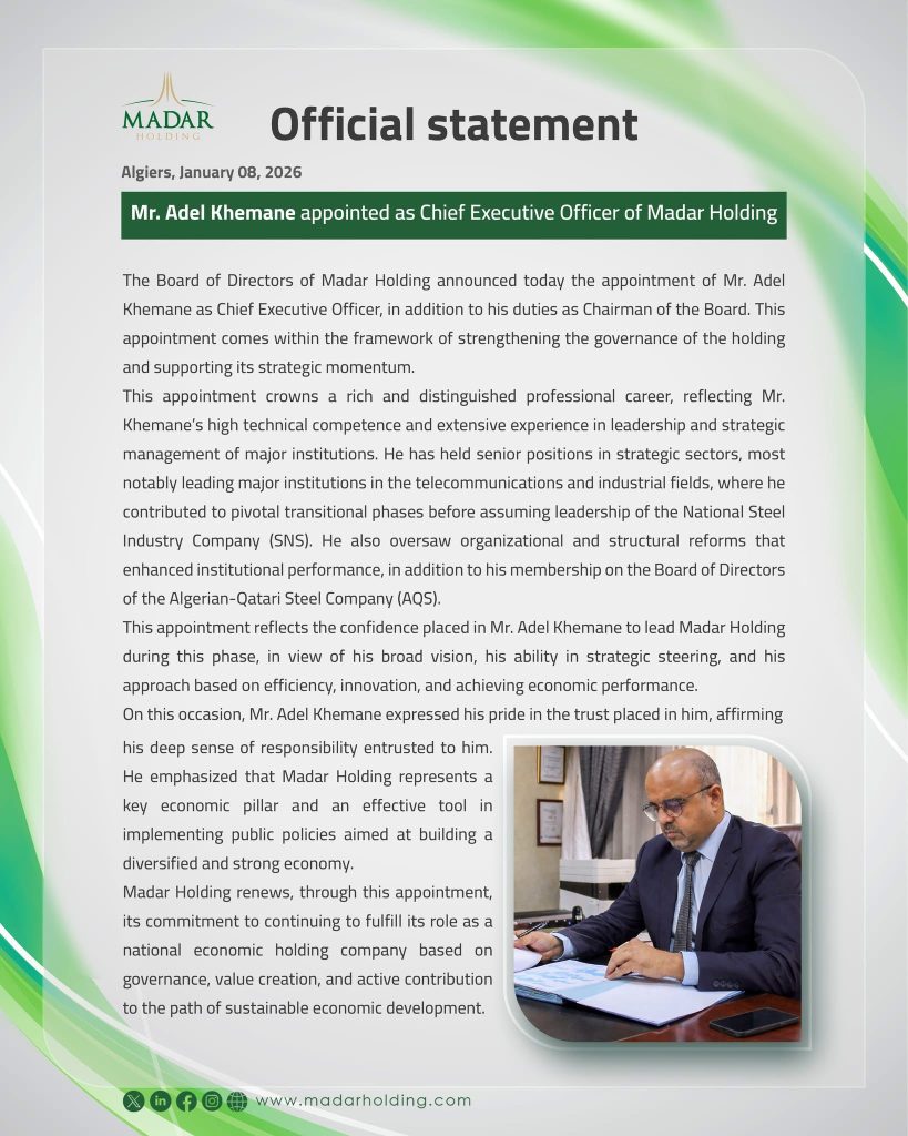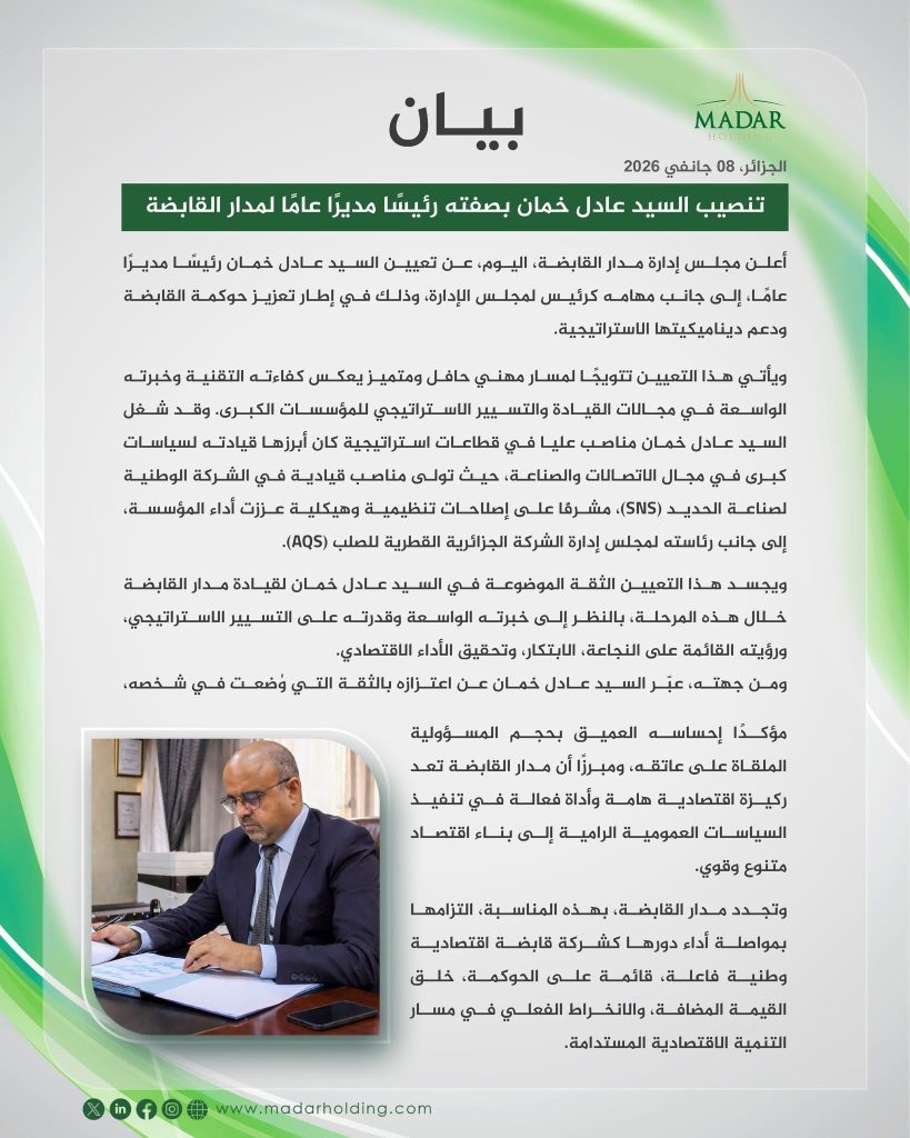 بوابة الجزائر الإخبارية: أعلن مجلس إدارة شركة “مدار” القابضة، عن تعيين عادل خمان رئيسًا مديرًا عامًا، إلى جانب مهامه كرئيس لمجلس الإدارة، وذلك في إطار تعزيز حوكمة القابضة ودعم ديناميكيتها الإستراتيجية.